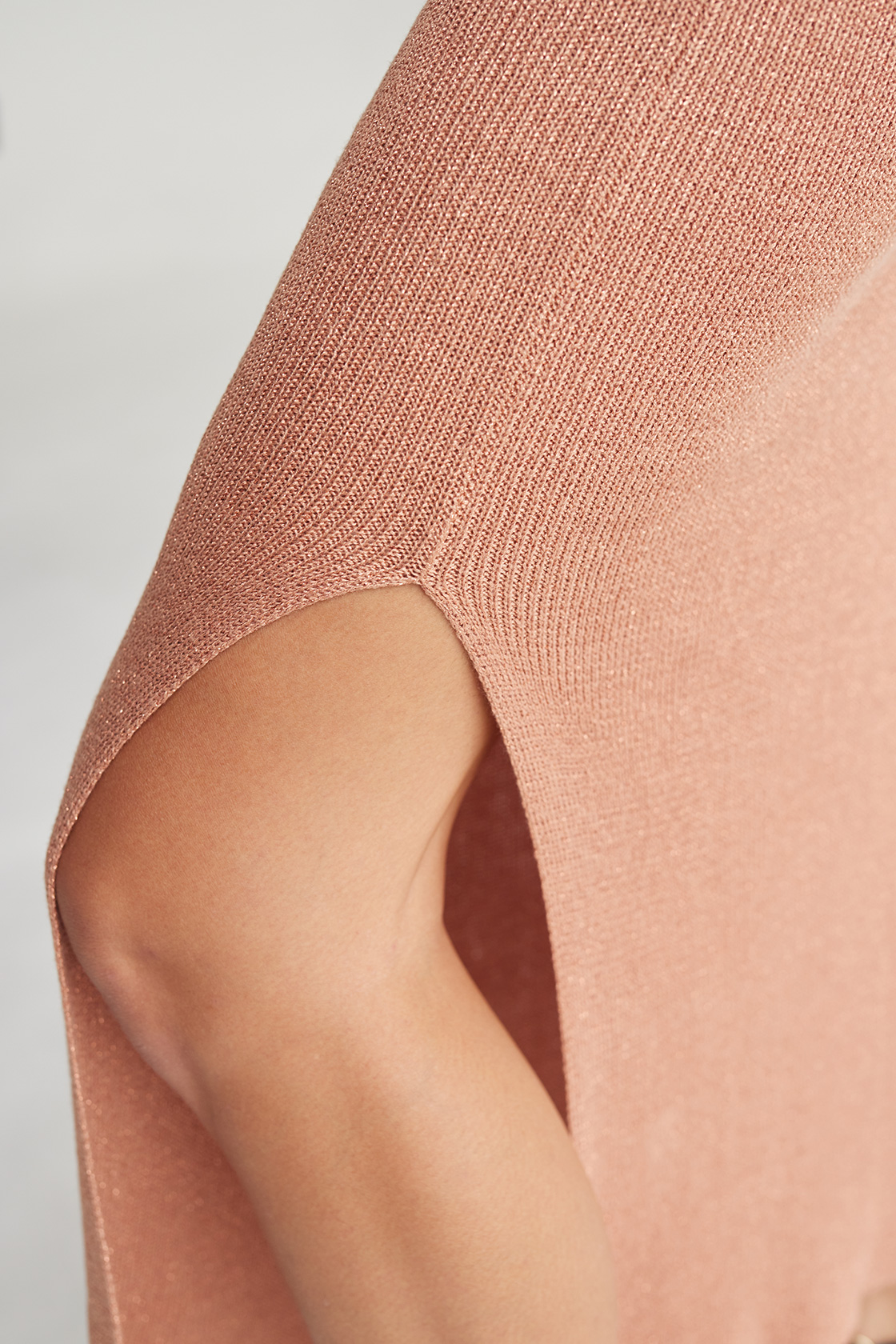 Knitted elegant two piece costume with short sleeves. Made of rayon and lurex, with sparkling effect.